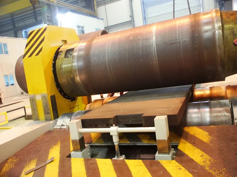 液壓全驅(qū)動(dòng)水平下調(diào)式三輥卷板機(jī),釆用右主油缸釆用上置,左主油紅下置式結(jié)構(gòu)。該機(jī)三個(gè)工作棍均為主驅(qū)動(dòng)輥,上輥由液壓馬達(dá)通過行星減速 機(jī)減速帶動(dòng)回轉(zhuǎn),下輥由液壓馬達(dá)通過行星減速機(jī)減速帶動(dòng)回轉(zhuǎn),行星驅(qū)動(dòng)裝置與卷輾軸直接耦合,可以大幅度減少負(fù)載損失(無用功),使盡可能 大的功(有用功)用于卷板;上掘的升降采用液壓傳動(dòng),升降位移由計(jì)算機(jī)控制,自動(dòng)調(diào)平,屏幕顯示,同步精度±0.2mm。下輥水平移動(dòng)采用機(jī)械 傳動(dòng),水平移動(dòng)通過蝸輪減速機(jī)減速,經(jīng)螺桿、螺母副轉(zhuǎn)換為直線運(yùn)動(dòng)帶動(dòng)。翻倒架的傾倒和復(fù)位采用液壓傳動(dòng)上的尾部裝有液壓平衡機(jī)構(gòu),可以方便卸出卷制后的工件及筒體。設(shè)有固定式操作臺(tái)和遙控按鈕盒各一個(gè),方便工人使用。設(shè)有安全聯(lián)鎖裝置,使操作更加安全。該機(jī)操作簡(jiǎn)單、維 修方便,卷制精度高,是一種先進(jìn)實(shí)用的大型卷板設(shè)備。